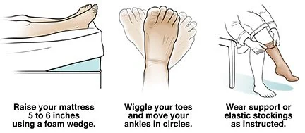 Keep your feet moving. Even small movements, like wiggling your toes or flexing your feet while resting, can help.